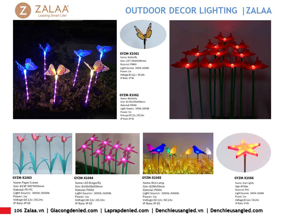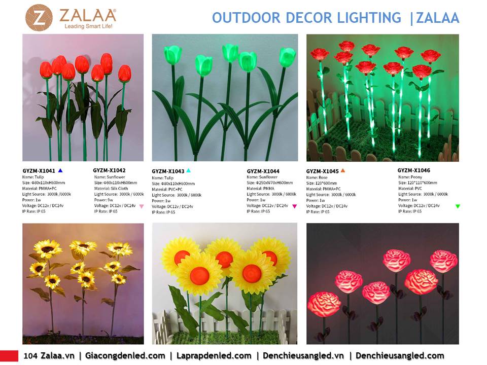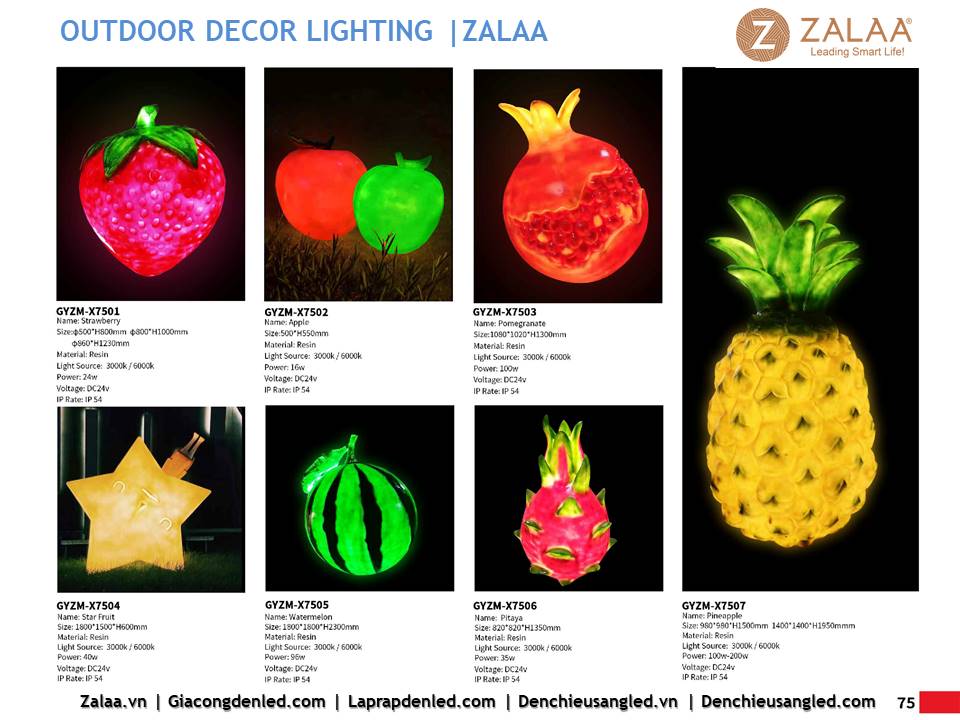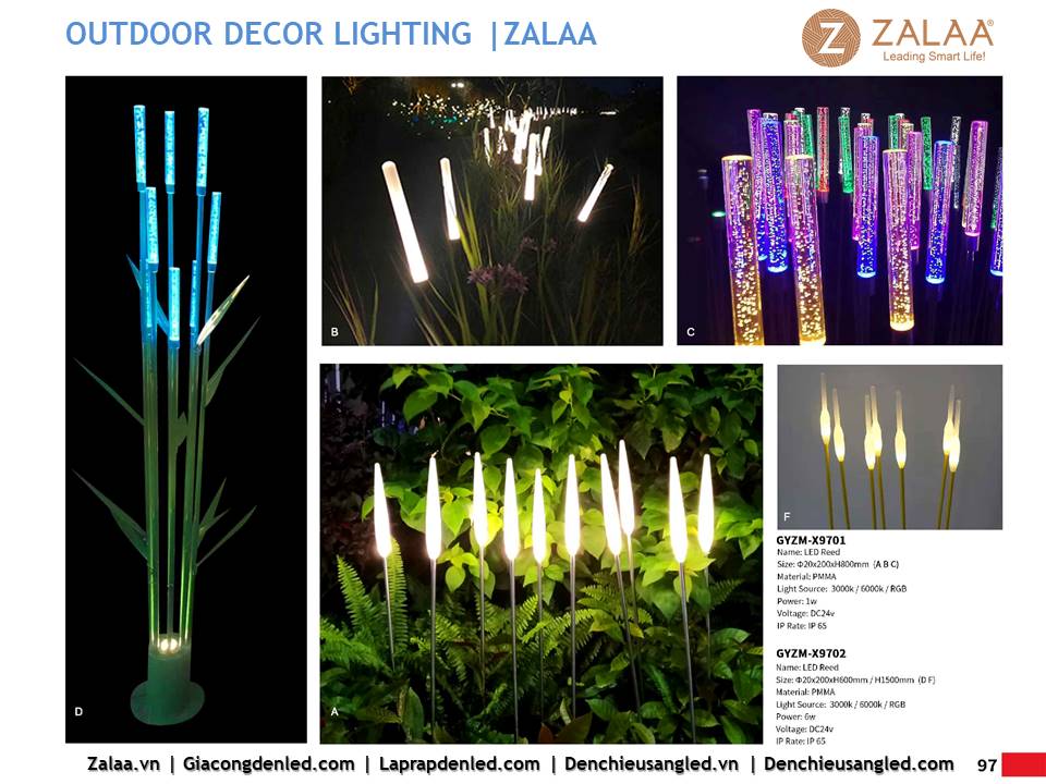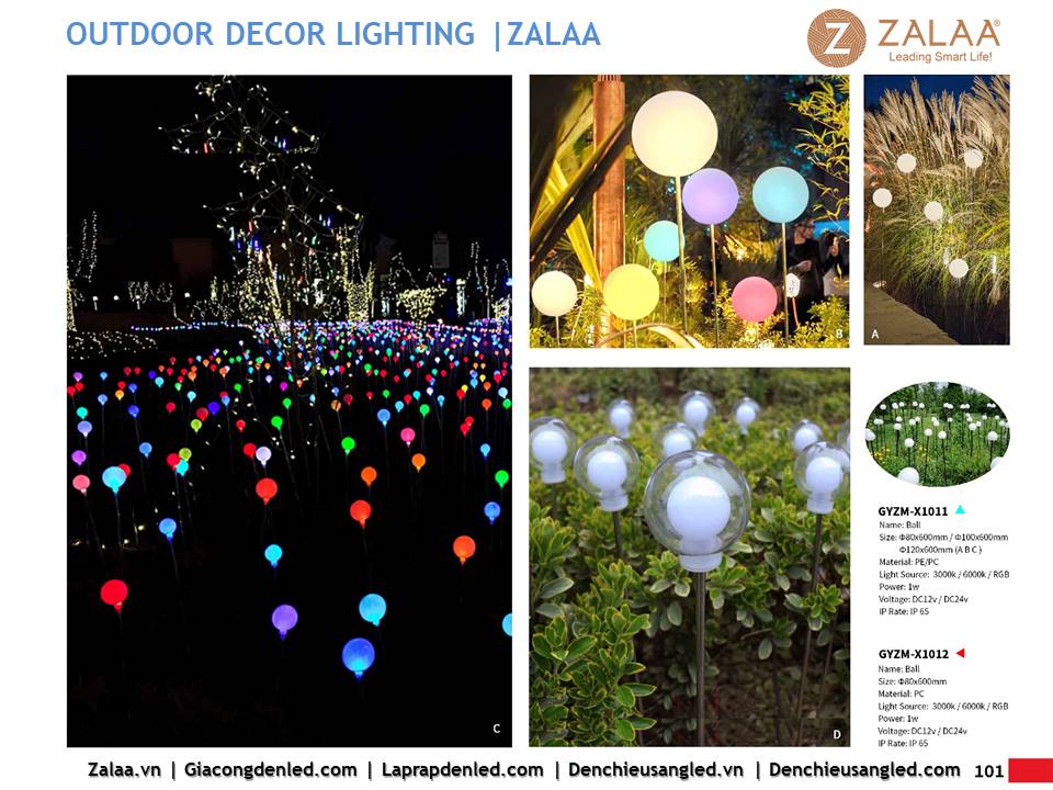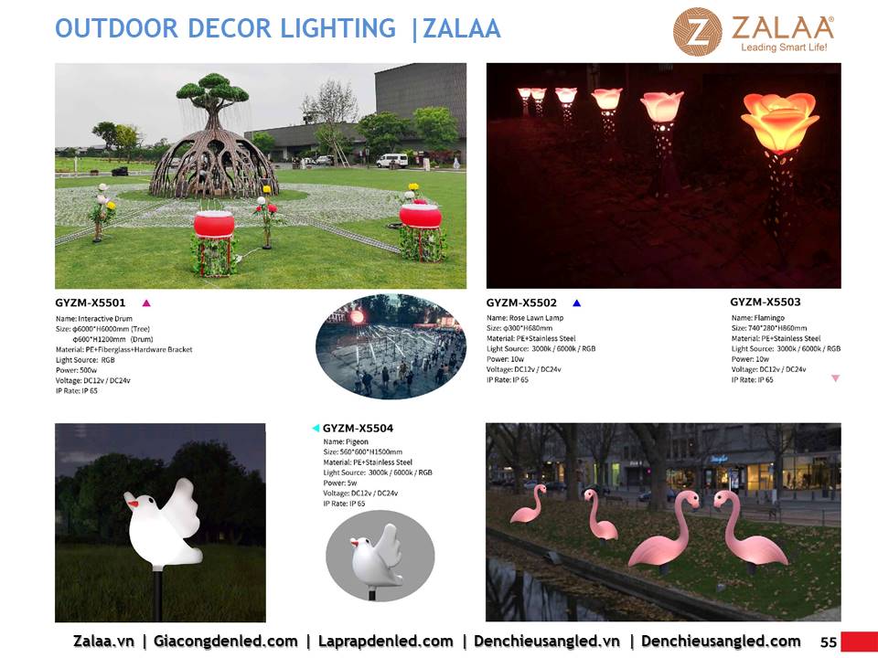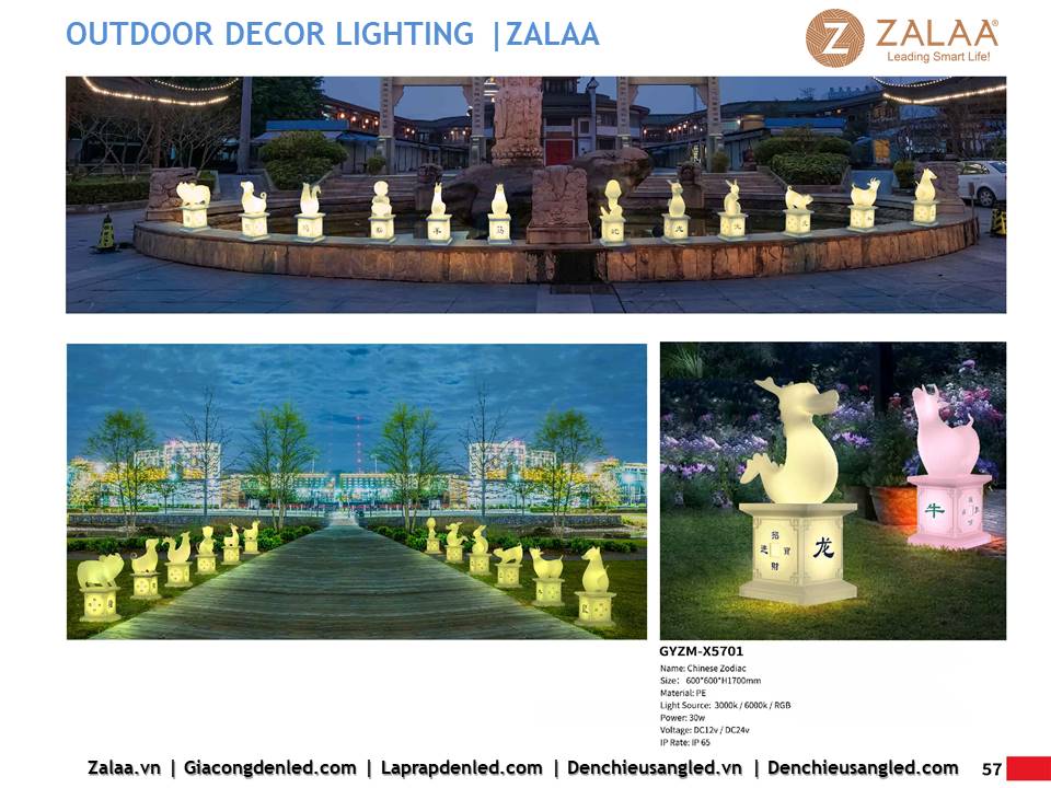 Hôm nay, ZALAA Lighting trân trọng giới thiệu Catalogue Đèn LED Decor Cảnh Quan Sân Vườn với hàng trăm mẫu thiết kế độc đáo sáng tạo theo yêu cầu, đem lại điểm nhấn rực rỡ cho mọi không gian ngoài trời: sân vườn, công viên, khuôn viên, biệt thự, homestay, resort...