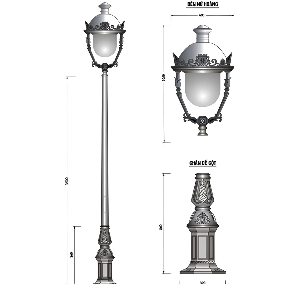 Đế cột đèn: Các loại đế cột đèn thường được sản xuất bằng chất liệu gang đúc có độ bền chắc cao nhằm giúp nâng đỡ và chịu được sức nặng của thân đèn và đèn.