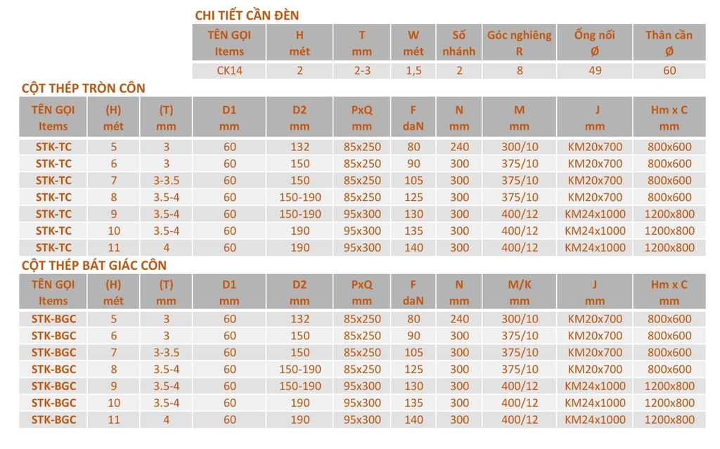 Cộng với giá cột theo báo giá chiều cao dưới đây:
