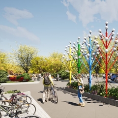 Mẫu cột đèn với nhiều tay đèn vào ban đêm rất đẹp, còn ban ngày có tính chất thẩm mỹ giống cây cảnh giúp cảnh quan thêm đặc sắc hơn.