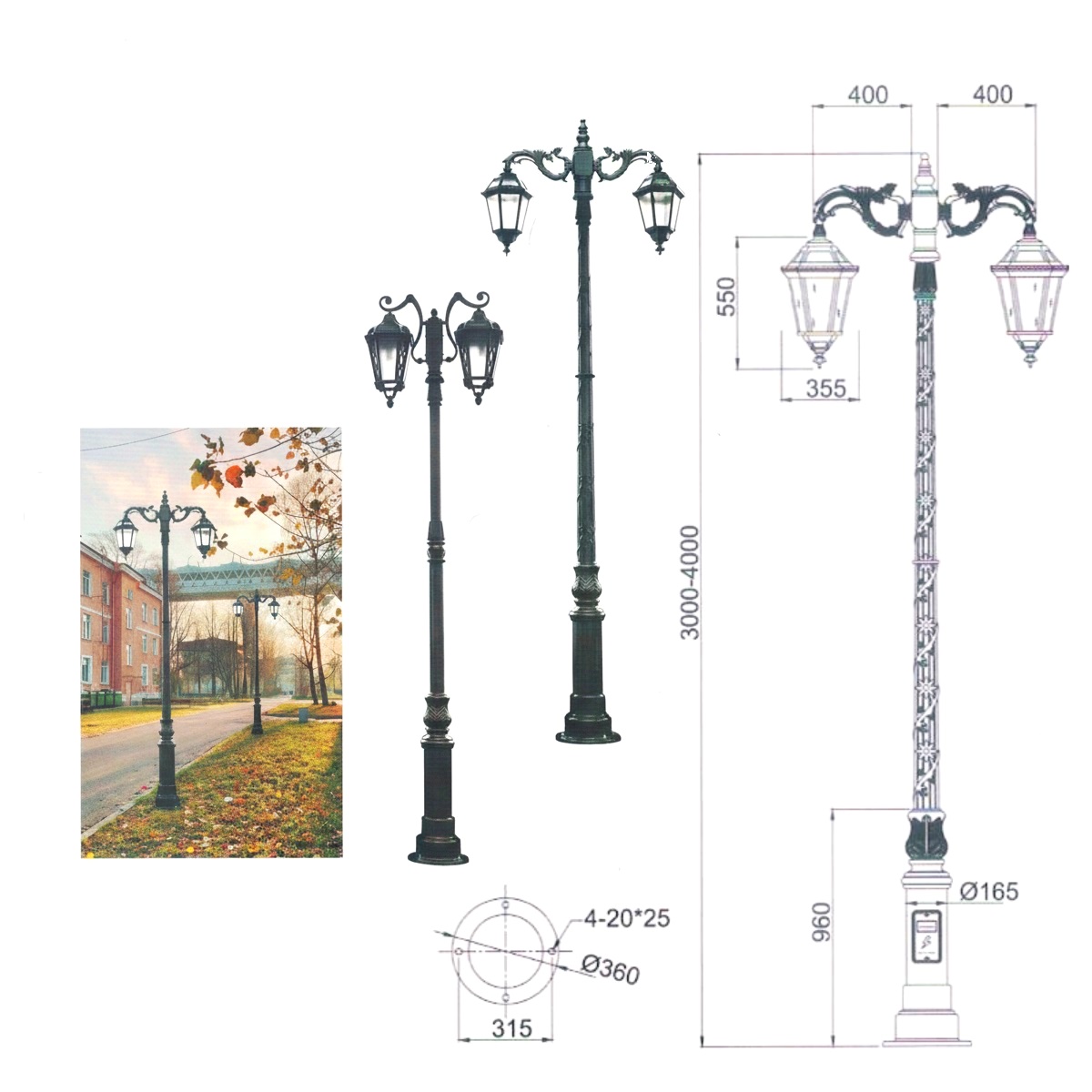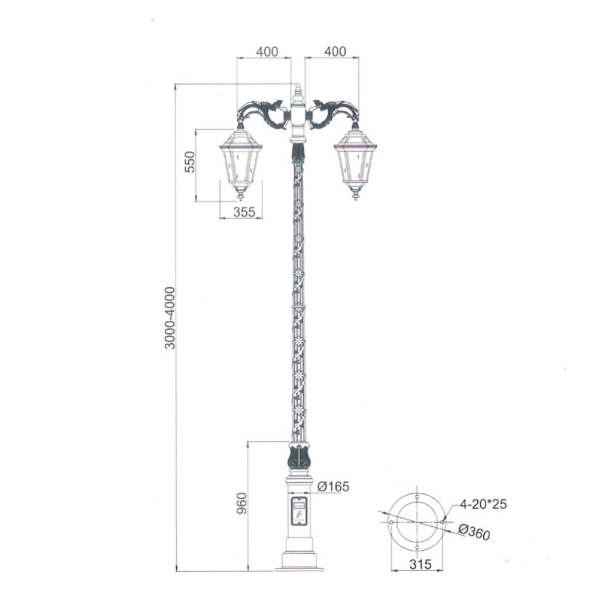 | ZSV-GLP EU004b | Cột đèn 1 bóng hoa văn | 3.0m – 4.0m | 400 mm |
