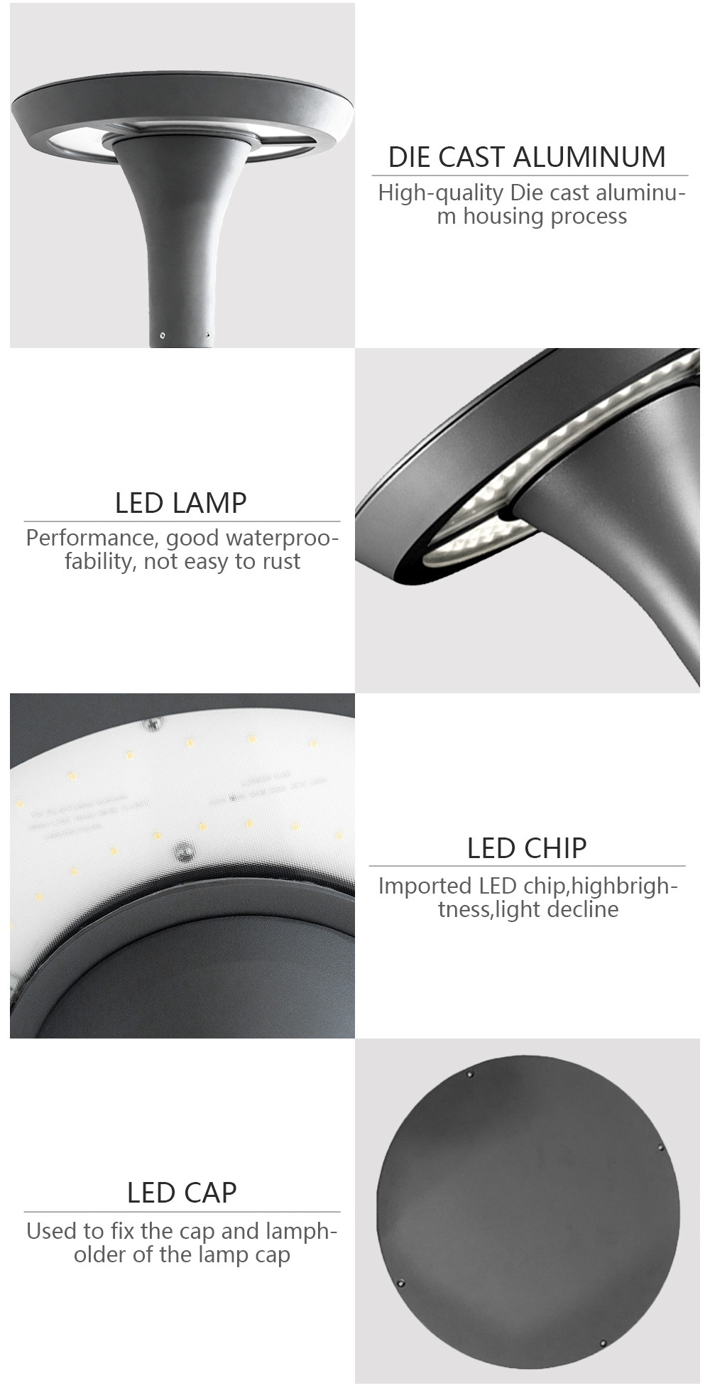 - - Thân đèn LED sân vườn được làm từ hợp kim nhôm cao cấp. Bề mặt của nó được trang bị lớp sơn tĩnh điện màu đen.