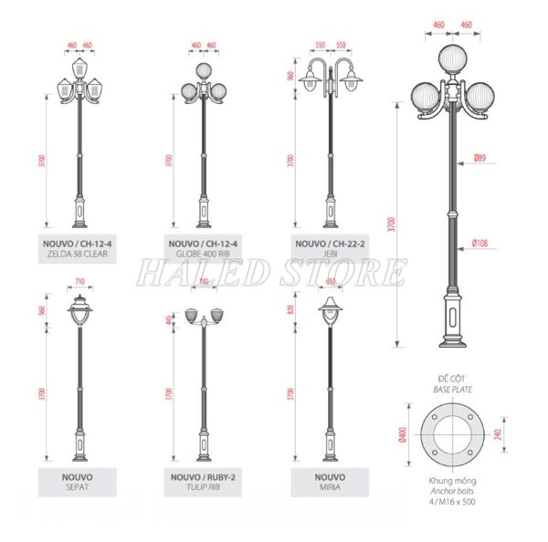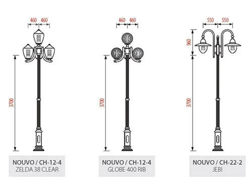 - Cột sân vườn Nouvo có đế bằng gang đúc mạ kẽm nhúng nóng được sơn màu theo yêu cầu, thiết kế đa dạng phù hợp với dùng cho chiếu sáng sân vườn, công viên, đường phố, khu vui chơi giải trí… Cột sân vườn Nouvo có thiết kế đẹp mắt, đảm bảo độ chiếu sáng và thẩm mỹ hợp với cảnh quan lắp đặt.