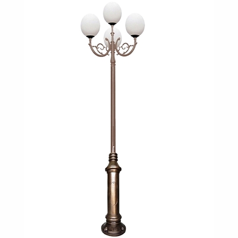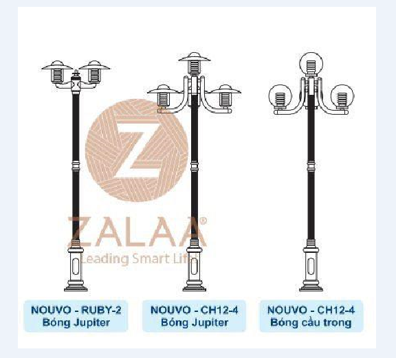 - Cột sân vườn Nouvo thân nhôm đúc, đế bằng nhôm hoặc gang đúc. Chùm đèn bằng nhôm định hình có cơ tính cao, được uốn trên máy uốn tự động đảm bảo độ chính xác và tính thẩm mỹ cao. Bề mặt được bảo vệ bằng anốt hóa và sơn phủ màu trang trí. Cột sân vườn Nouvo có thể lắp được nhiều loại đèn cầu và các công suất khác nhau.