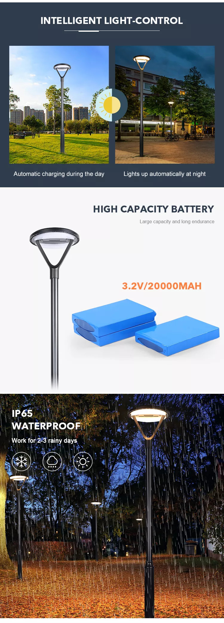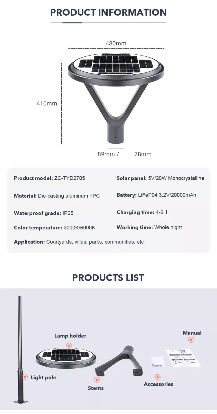 ZG-TYD2705 là mẫu đầu Đèn trang trí hiện đại sử dụng năng lượng mặt trời để chiếu sáng cảnh quan sân vườn, đường dẫn vào các khu căn hộ chung cư, nhà ở, homestay, khách sạn, nhà nghỉ cao cấp, villages, biệt thự,… Sản phẩm sử dụng Chip LED 2835, Pin LiFePO4 3.2V, Tấm pin 5V/20W ứng với kích thước đầu đèn 48*H41cm. (bộ đèn chưa bao gồm cột kèm theo)