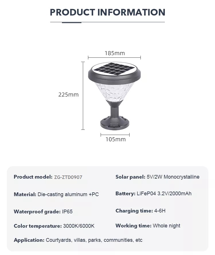 ZG-ZTD9007 là đèn trang trí trụ cổng tường rào cảnh quan sân vườn ngoài trời có kiểu dáng tròn thon, kính phale, Sử dụng năng lượng mặt trời để chiếu sáng dùng cho các không gian như cảnh quan sân vườn, biệt thự, công viên, vui chơi cộng đồng, vv...Công Suất Tấm Pin/Đèn 5V/2W, Pin 3.2/2000mAh. Sản phẩm do ZALAA Solar Garden nhập khẩu và phân phối tại Việt Nam. Giá bán trên web là tham khảo, các chủ đầu tư sẽ được báo theo giá cấp cho dự án, công trình