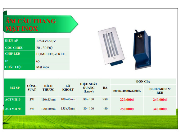 - - Chip led: Đèn âm cầu thang sử dụng chip high power cao cấp về chất lượng ánh sáng, chỉ số hoàn màu cao, hiệu suất phát quang lớn và tuổi thọ lâu bền.