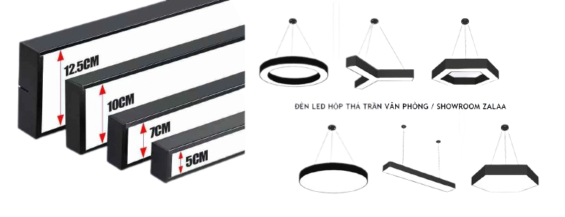 - Đèn được thiết kế theo nhiều hình dạng, kích thước khác nhau, trong đó phổ biến là dạng hình đèn hộp thả trần 1.2m có bản rộng 40mm, 70mm, 100mm, 200mm.