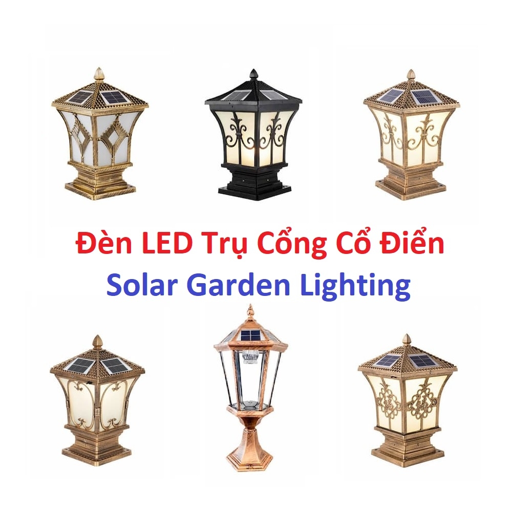 Các mẫu đèn trụ cổng tường rào kiểu dáng cổ điển, quen thuộc thường dùng trang trí và chiếu sáng cảnh quan sân vườn ngoài trời cho các khu biệt thử phủ, nhà thờ, khu tưởng niệm cổ kính, Đèn sử dụng năng lượng mặt trời để chiếu sáng.