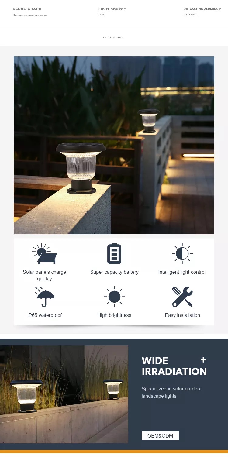 Mã Sản Phẩm ZG-ZTD2204 là đèn trụ cổng, cột, hàng rào sử dụng năng lượng mặt trời để chiếu sáng dùng cho các không gian như cảnh quan sân vườn, biệt thự, công viên, vui chơi picnic cộng đồng, vv...Công Suất Tấm Pin/Đèn 5V/4.5W, Thời gian (Charge time): 3-6h, IP65. Sản phẩm do ZALAA Solar Garden nhập khẩu và phân phối tại Việt Nam.