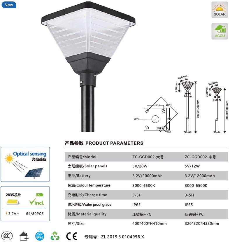 ZG-GGD002 là mẫu đầu Đèn Trang trí hiện đại sử dụng năng lượng mặt trời để chiếu sáng cảnh quan sân vườn, đường dẫn vào các khu căn hộ chung cư, nhà ở, homestay, khách sạn, nhà nghỉ cao cấp, villages, biệt thự,… Sản phẩm sử dụng Chip LED 2835, Pin LiFePO4 3.2V, Tấm pin 16W/5V, 25W/5V ứng với 2 kích thước đầu đèn 410mm * H383mm , 530mm * H490mm. (bộ đèn chưa bao gồm cột kèm theo)