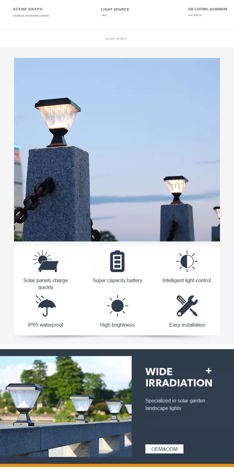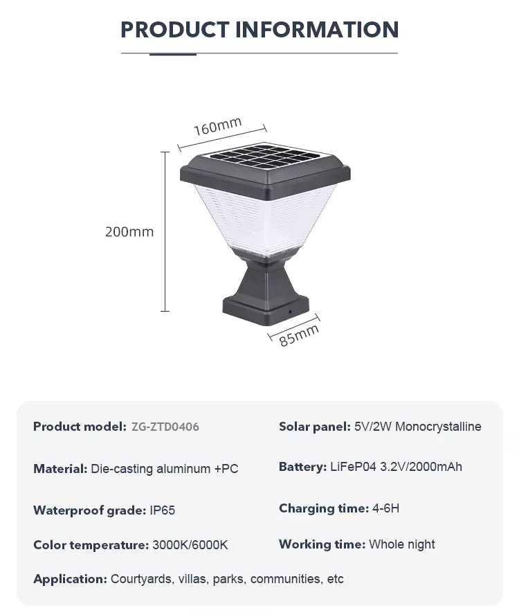 ZG-ZTD0406 là đèn trang trí trụ cột trên cầu, cổng, hàng rào sân vườn ngoài trời có kiểu dáng vuông đầu, Sử dụng năng lượng mặt trời để chiếu sáng dùng cho các không gian như cảnh quan sân vườn, biệt thự, công viên, vui chơi cộng đồng, vv...Công Suất Tấm Pin/Đèn 5V/2W, Pin 3.2/2000mAh. Sản phẩm do ZALAA Solar Garden nhập khẩu và phân phối tại Việt Nam. Giá bán trên web là tham khảo, các chủ đầu tư sẽ được báo theo giá cấp cho dự án, công trình