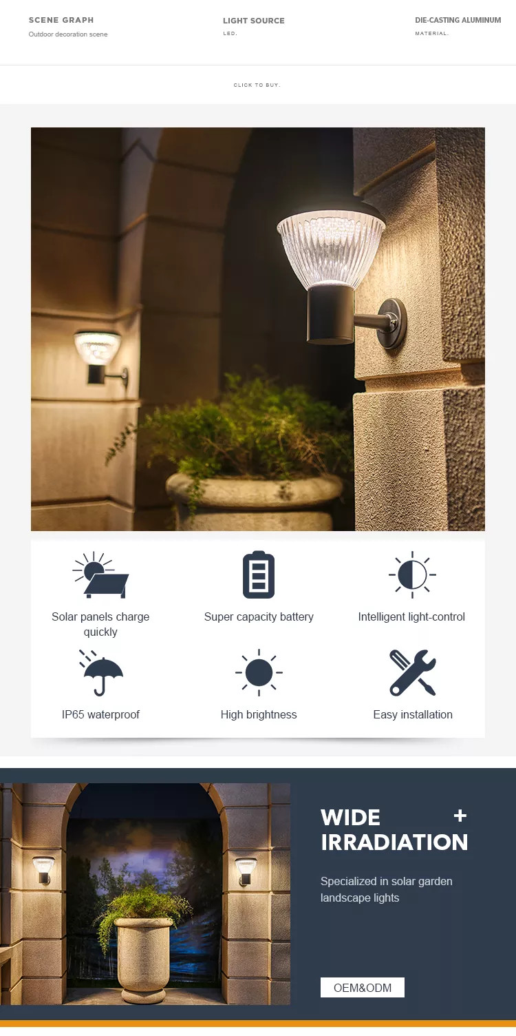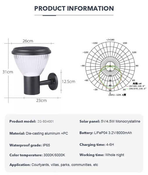 ZG-BD4001 là đèn tường ngoại thất gắn tường nhà, treo tường rào sân vườn ngoài trời IP65, Sử dụng năng lượng mặt trời để chiếu sáng và trang trí các không gian như cảnh quan ngoại thất tòa nhà, Biệt thự nhà vườn, Villa nghỉ dưỡng, Shophouse hiện đại, Homestay cao cấp, vv...Công Suất Tấm Pin/Đèn 5V/4.5W-MONO,