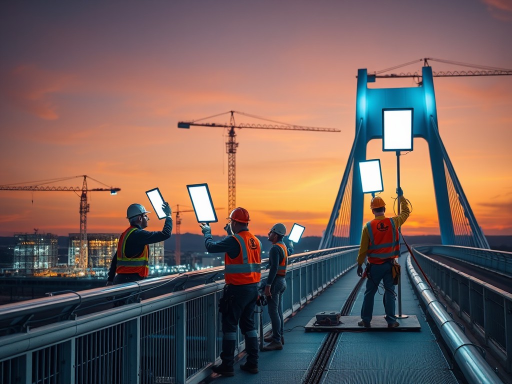 Hình ảnh 9: Quy trình lắp đặt đèn LED trên cầu / Minh họa đội ngũ kỹ thuật thi công hệ thống chiếu sáng cầu.