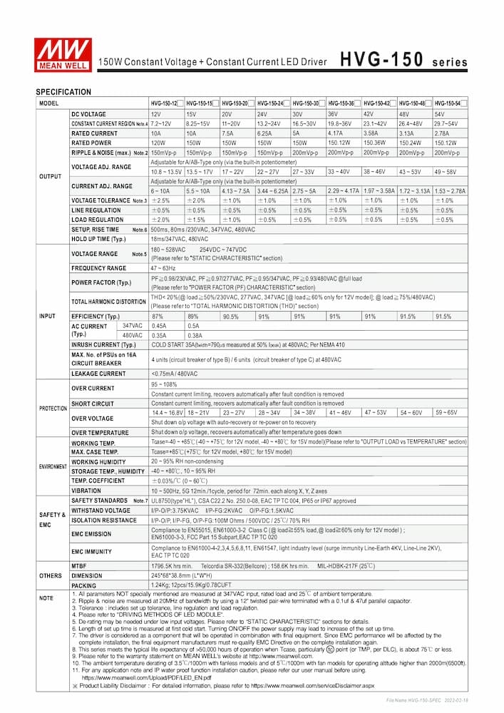 Meanwell HVG-150 SERIES: ( Click xem thông số kỹ thuật từ hãng tại đây)