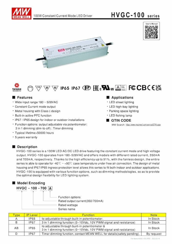 Nguồn Đèn LED Driver Meanwell HVGC-100, công suất 99.4W ~ 100W, Điện Áp đầu vào 180 ~ 528VAC, Các mã sản phẩm C.C.: HVGC-100-350m - 700m, Vỏ kim loại, thiết kế IP67, ứng dụng cho Đèn LED ngoài trời công suất cao như (LED Street lighting, LED High-bay lighting, Parking space lighting, LED fishing lamp) L.hệ tư vấn thêm...