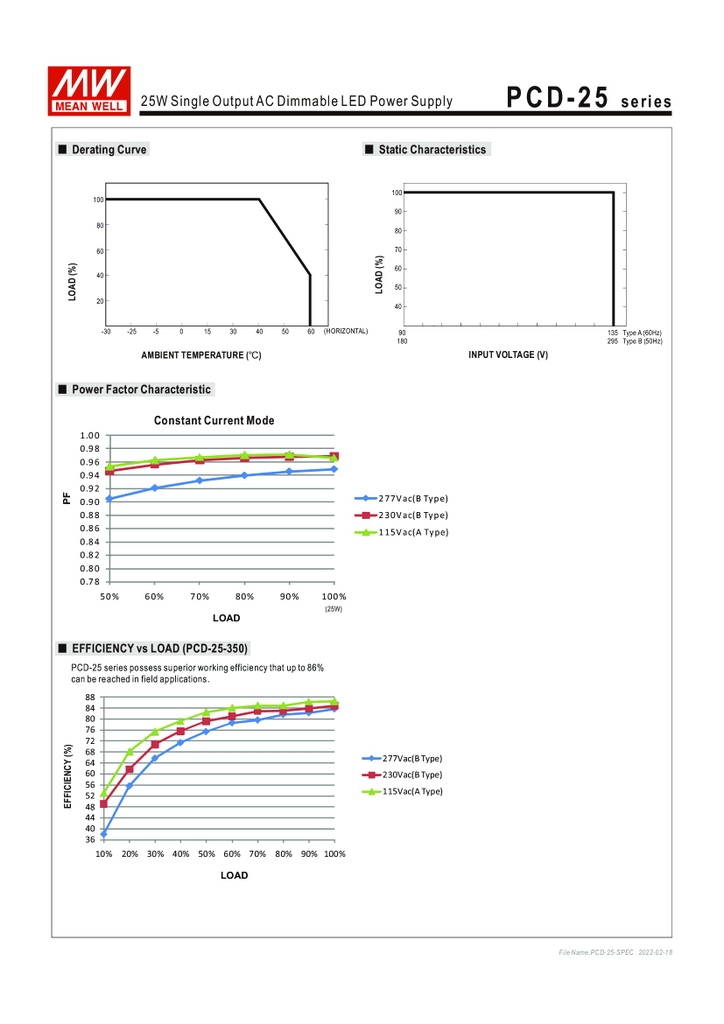 POWER FACTOR (Typ.) | PF>0.9/115VAC, PF>0.9/230VAC, PF>0.9/277VAC at full load (Please refer to "Power Factor Characteristic" curve) | |||||