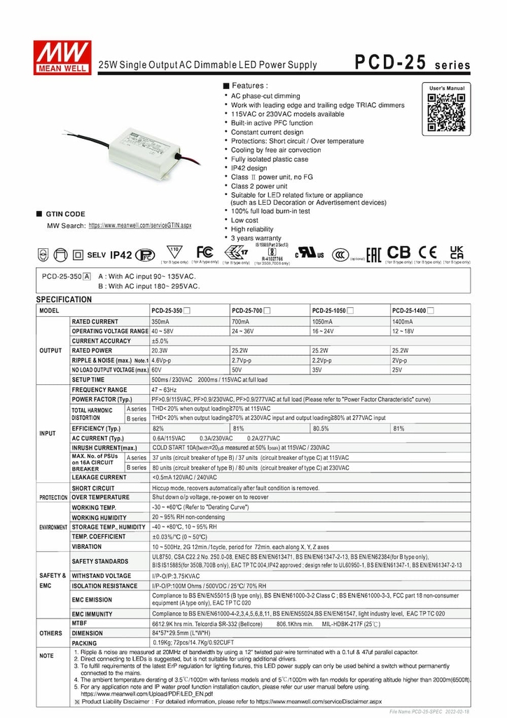 Bao gồm các mã sản phẩm nổi bật như: PCD-25-350, PCD-25-700, PCD-25-1050, PCD-25-1400.
