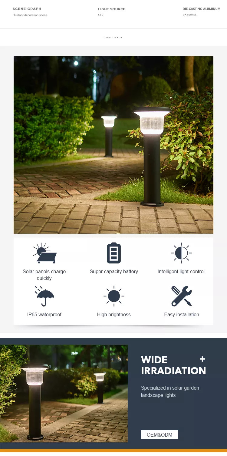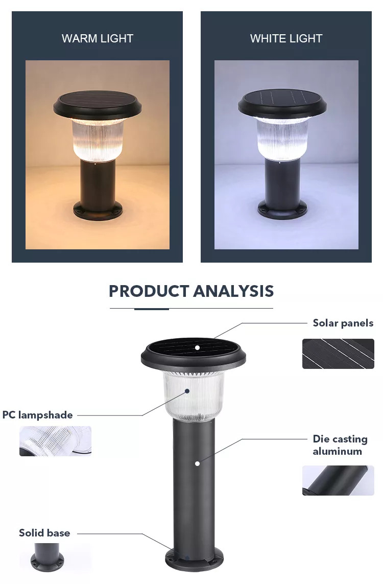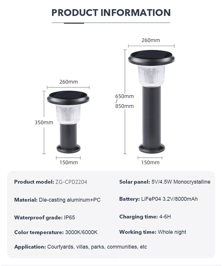 ZG-CPD2204 là mẫu trụ đèn nấm sân vườn, cột đèn thấp IP65, Sử dụng năng lượng mặt trời để chiếu sáng trang trí các không gian như cảnh quan đường đi, bãi cỏ ngoại thất tòa nhà, Biệt thự nhà vườn, Villa nghỉ dưỡng, Shophouse hiện đại, Homestay cao cấp, vv...Công Suất Tấm Pin/Đèn 5V/4.5W-Mono, Pin: 3.2V 8000mAh LiFePO4.