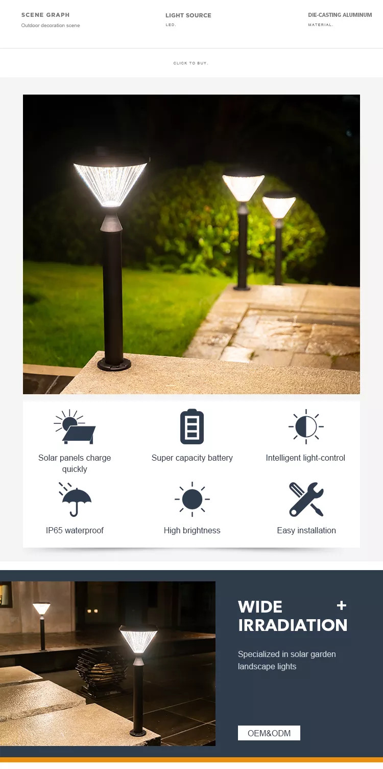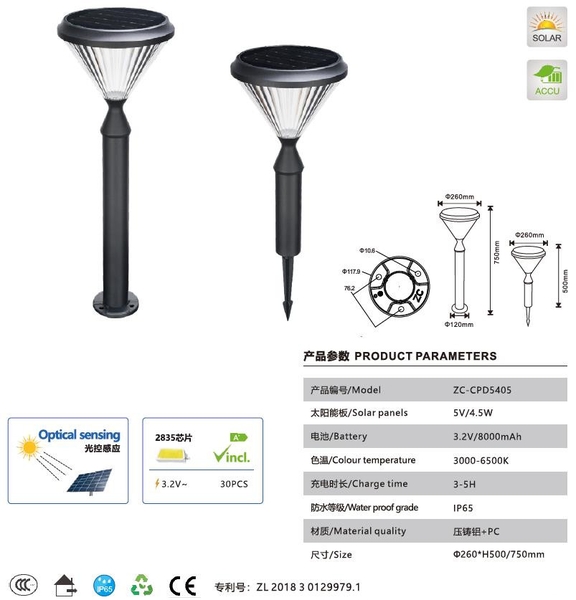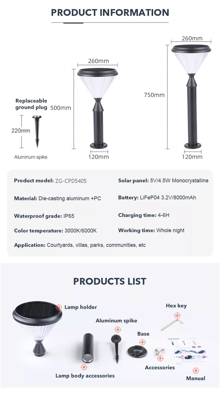 ZG-CPD5405 là mẫu Trụ nấm sân vườn, đèn trụ, cột đèn thấp IP65, Sử dụng năng lượng mặt trời để chiếu sáng trang trí các không gian như cảnh quan đường đi, bãi cỏ ngoại thất tòa nhà, Biệt thự nhà vườn, Villa nghỉ dưỡng, Shophouse hiện đại, Homestay cao cấp, vv...Công Suất Tấm Pin/Đèn 5V/4.5W-Mono, Pin: 3.2V/8000mAh LiFePO4.