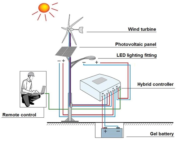 Hệ thống chiếu sáng đường phố lai năng lượng mặt trời gió là hệ thống chiếu sáng đường phố LED độc lập thông minh và hoàn chỉnh. Bao gồm các mô-đun năng lượng mặt trời và tua-bin gió nhỏ, pin chu kỳ sâu, bộ điều khiển và một hoặc một vài đèn đường, hệ thống hybrid này thu năng lượng từ cả gió và mặt trời và lưu trữ trong pin chu kỳ sâu để cung cấp năng lượng cho đèn đường vào ban đêm. Sử dụng kết hợp các nguồn năng lượng gió và mặt trời, hệ thống sẽ cung cấp dòng điện ổn định và liên tục để cung cấp năng lượng cho hệ thống chiếu sáng đường phố.